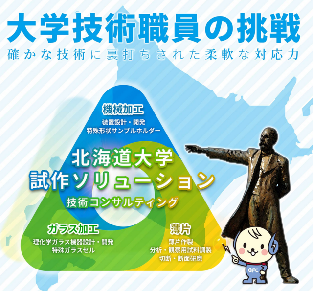 私たち技術職員の存在目的は、北海道⼤学の教育と研究⼒の強化・推進です。そのためには、あらゆるニーズに応える⾼度な技術と発想⼒が必要です。