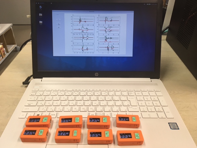 8点同時無線測定システム(オレンジの小箱が3軸加速度センサー端末)